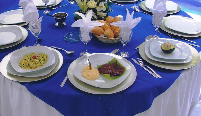 Menu a 4 Tiempos Entrada o postre Crema Pasta Plato fuerte con guarnición Pan Paneras, servillestas, saleros, utencilios. Personal de cocina $265/Persona Loza Vajilla $36 Cubiertos$25 Vasos$8 Loza Completa$49
